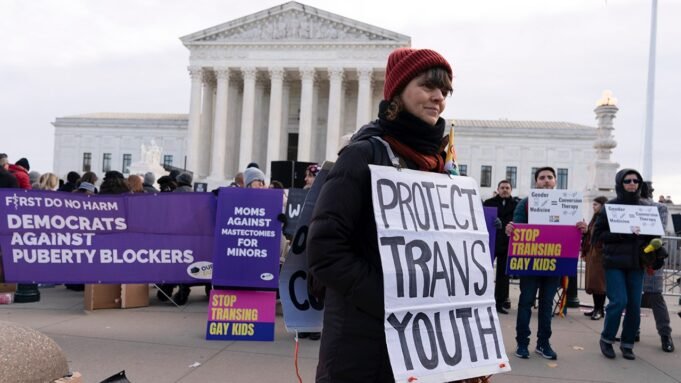 Los manifestantes a favor y en contra de los procedimientos médicos para menores transgénero se demuestran fuera de la Corte Suprema el 4 de diciembre de 2024 en Washington. (AP Photo/Jose Luis Magana, archivo)