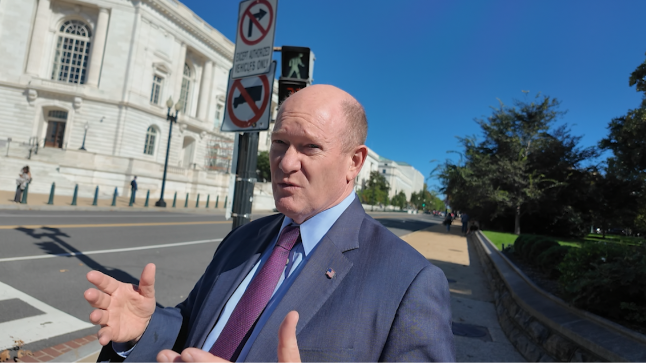 El senador Chris Coons, demócrata por Delaware, camina por el metro del Senado en el Capitolio de los Estados Unidos en Washington, enero de 2025. (Anna Moneymaker/Getty Images)