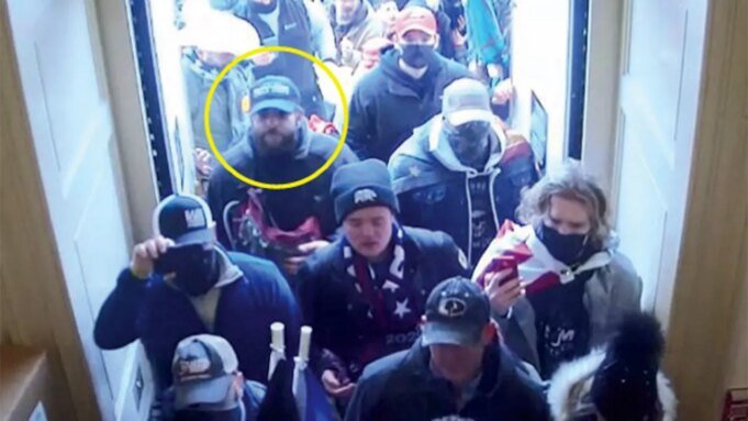 Taylor Taranto, que se muestra aquí el 6 de enero de 2021, con un círculo amarillo, fue condenado en un juicio sin jurado a principios de este año. (Departamento de Justicia)