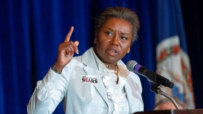 El vicegobernador republicano de Virginia, Winsome Earle-Sears, hace gestos en el escenario en un evento en McLean, Virginia. (Cliff Owen/AP Foto-Archivo)