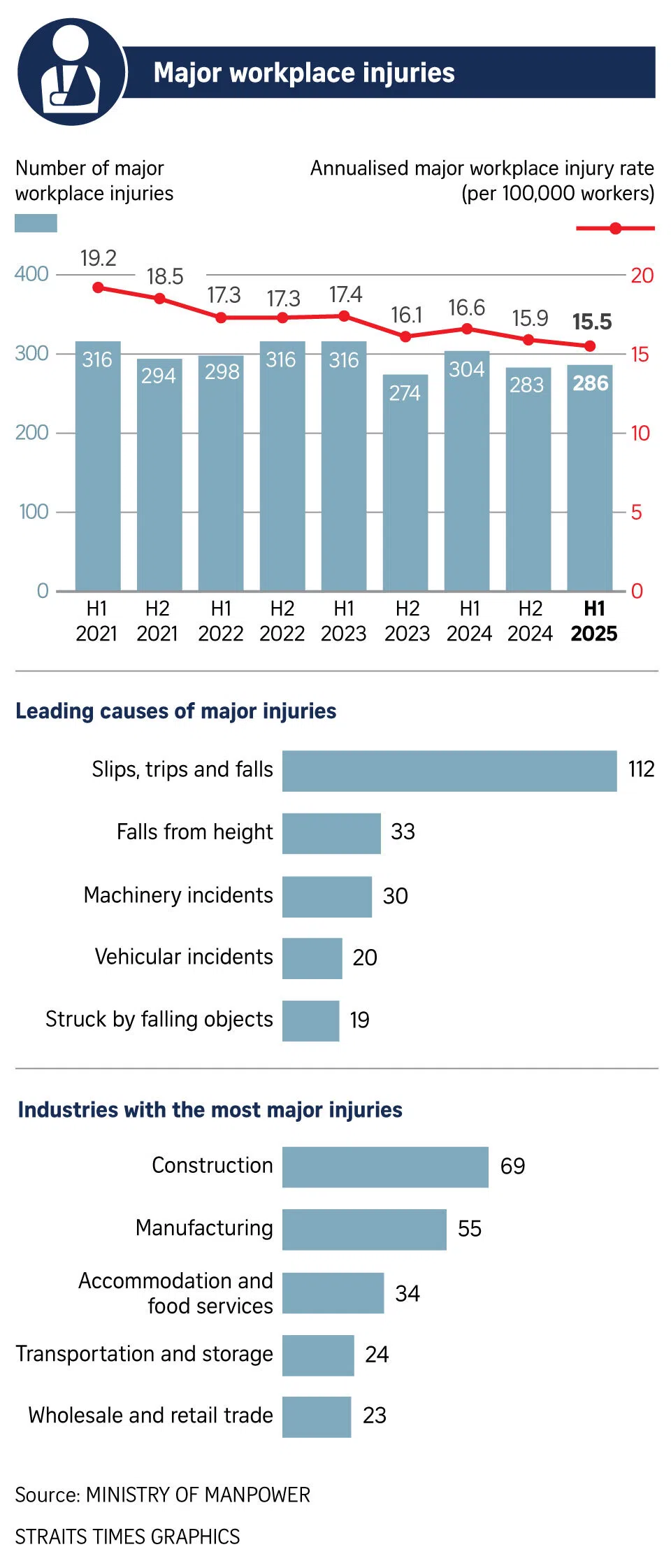 Otras causas principales de muerte cayeron desde la altura y fueron golpeadas por objetos en movimiento, dijo el Ministerio de Manpower (MOM) el 30 de septiembre.