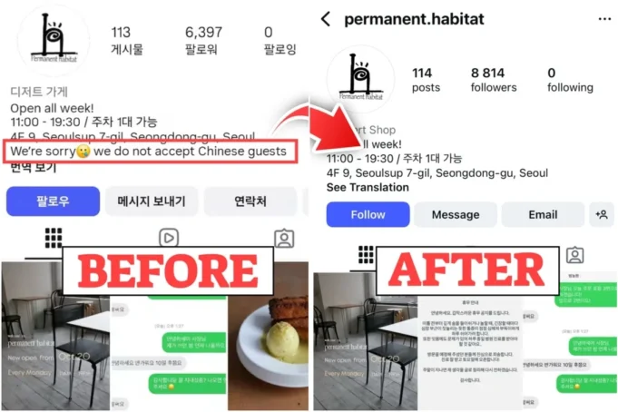 El café, identificado como una residencia permanente, se convirtió en el centro de la reacción pública a finales de octubre después de que publicara el mensaje: “Lo sentimos. No aceptamos invitados chinos”. La publicación se difundió rápidamente en las redes sociales de Corea del Sur y China, provocando acalorados debates sobre el racismo y