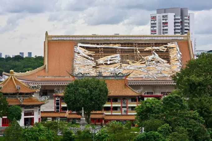 SINGAPUR – Dos edificios en el monasterio Kong Meng Sun Four Kirk Si están cerrados al público después de que se cayeron partes de las tejas y el marco de soporte del techo de un edificio. 26 de noviembre.