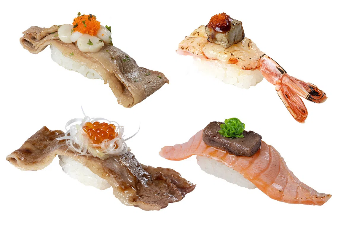 La promoción actual de Sushi Express incluye artículos especiales como (en el sentido de las agujas del reloj desde la parte superior izquierda) Wagyu a la parrilla con vieiras, Aka Ebi con foie gras, Wagyu con salmón Aburi y Wagyu Ikura a la parrilla.