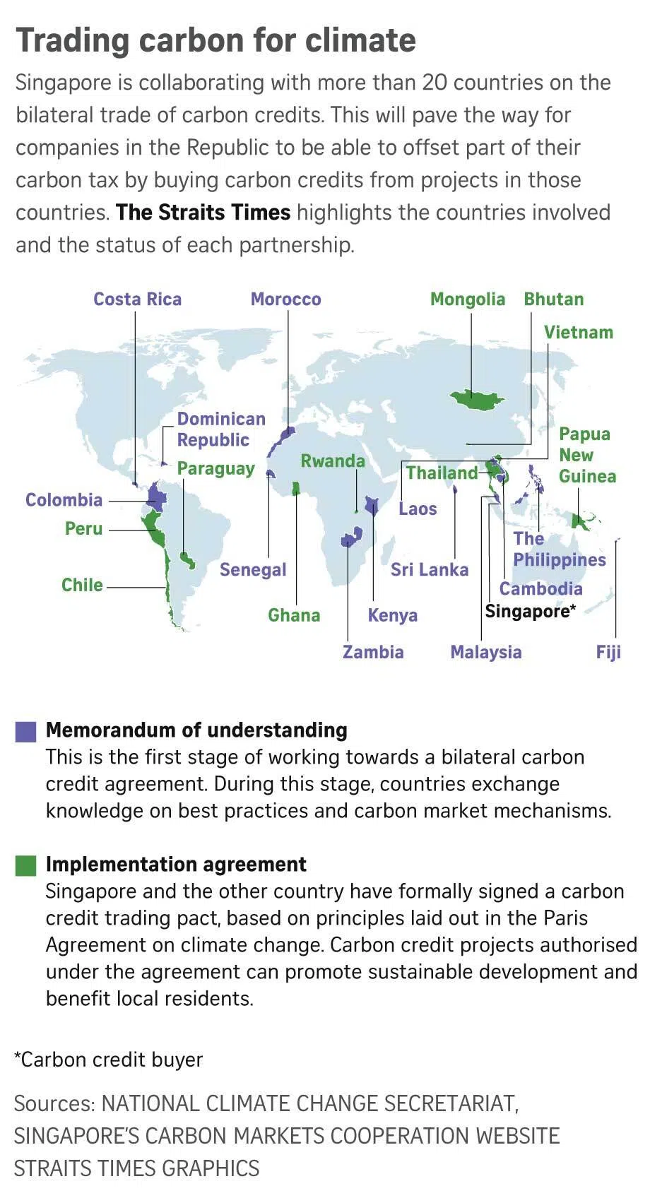Estos acuerdos allanaron el camino para que las empresas que pagan impuestos sobre el carbono en Singapur, así como el gobierno, compren créditos para compensar las emisiones de calentamiento global de algunas empresas derivadas de proyectos de carbono en estos países.