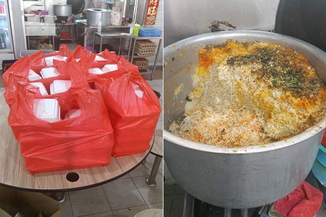 Puesto de vendedores ambulantes Muhammad Shazen Fayha Muslim Food Paradise en Tong Bahro BazaEstaban programados cinco paquetes de pollo y cordero Briani.