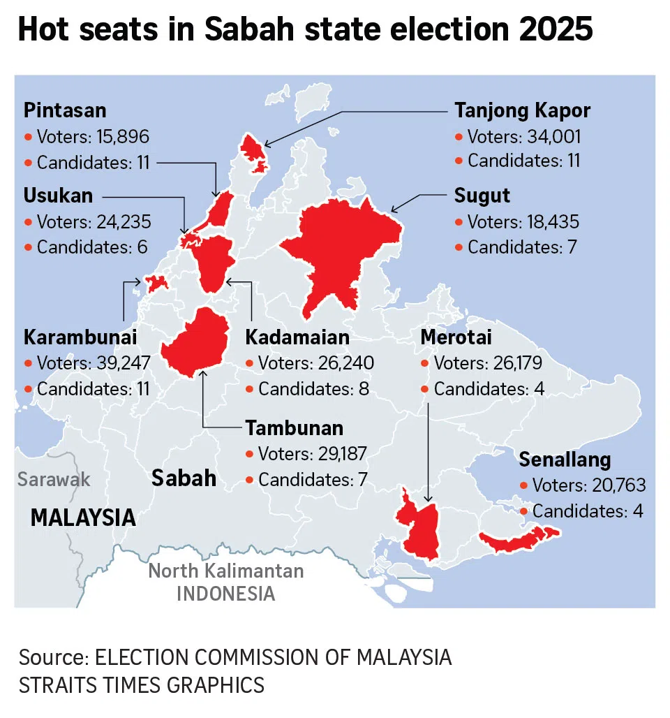 Otros escaños muy disputados incluyen Kadamayan, donde el presidente de UPKO, Ion, se enfrenta a siete contendientes, y Tambunan, donde el presidente de STAR, Jeffrey Kitingan, se enfrenta a seis contendientes.