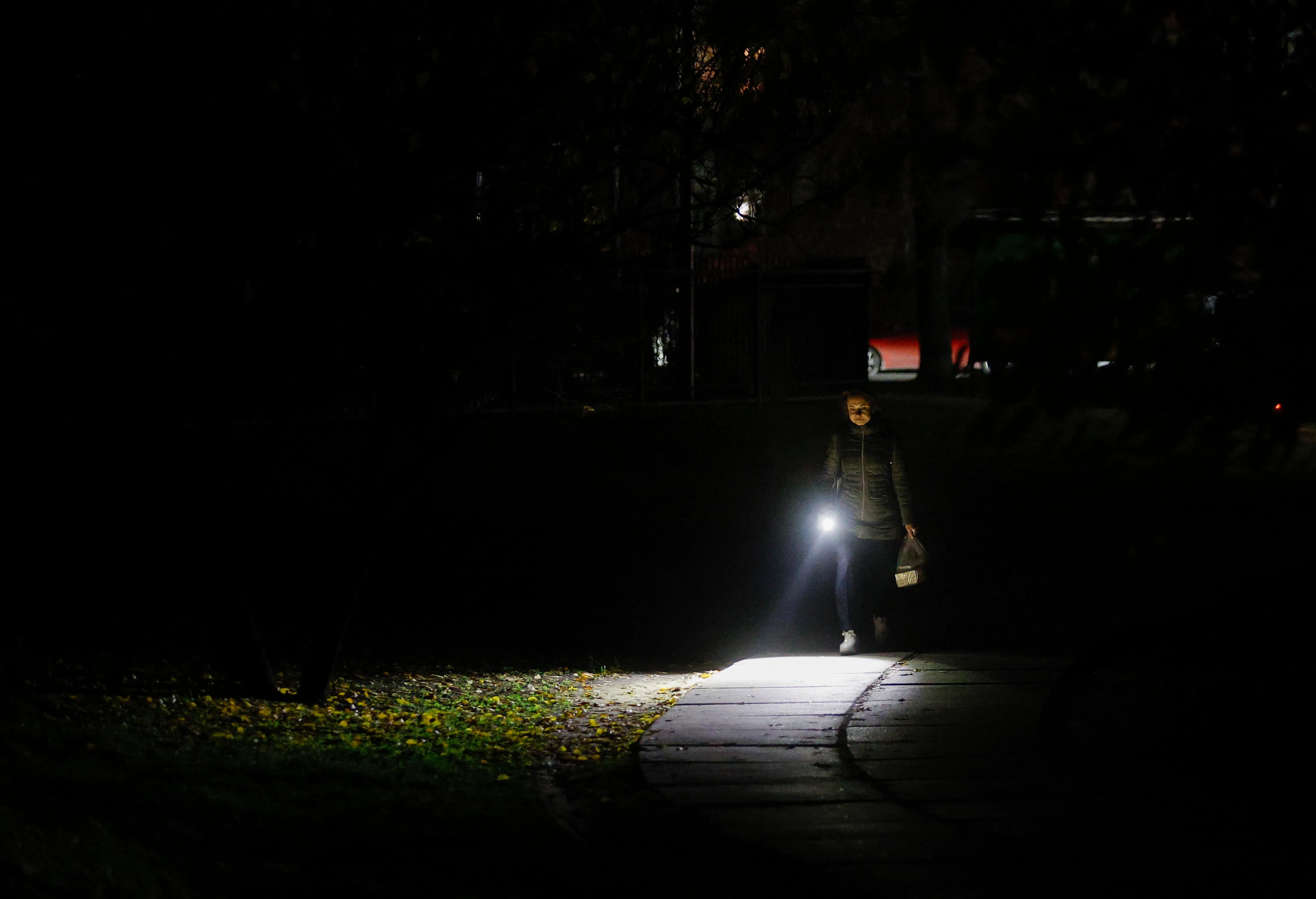 Un hombre camina con una linterna por una calle oscura durante un corte de energía en Kiev, Ucrania, el 10 de noviembre.