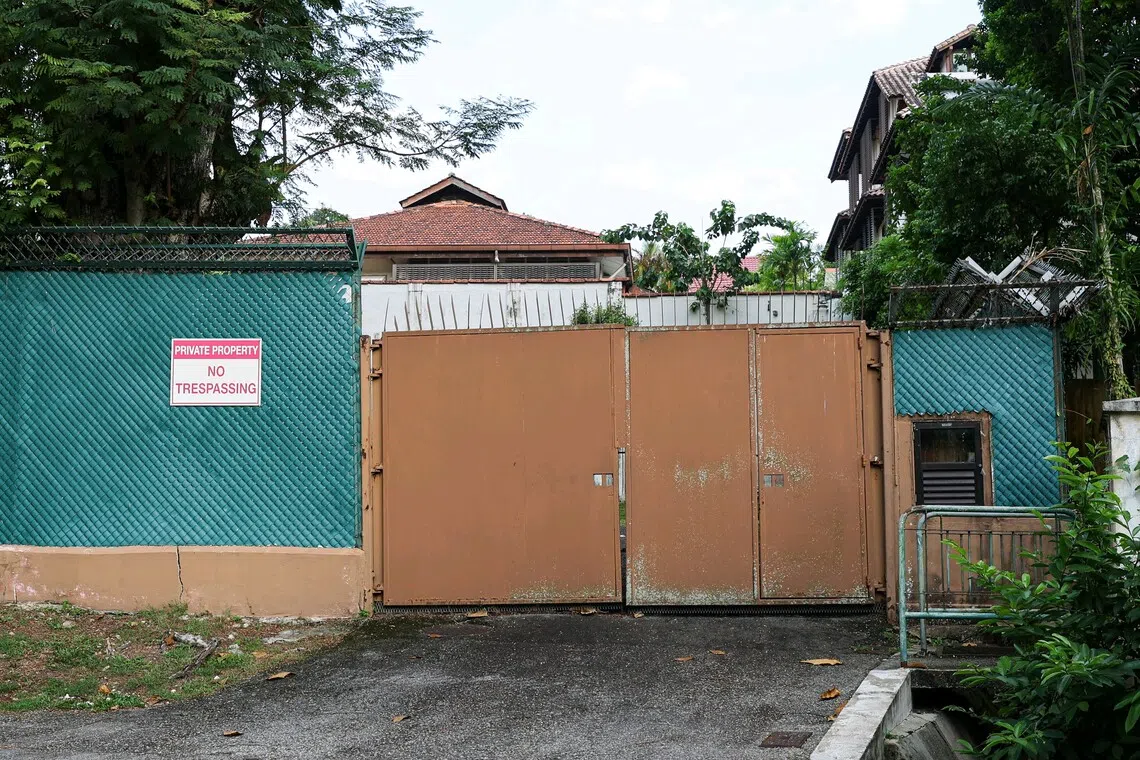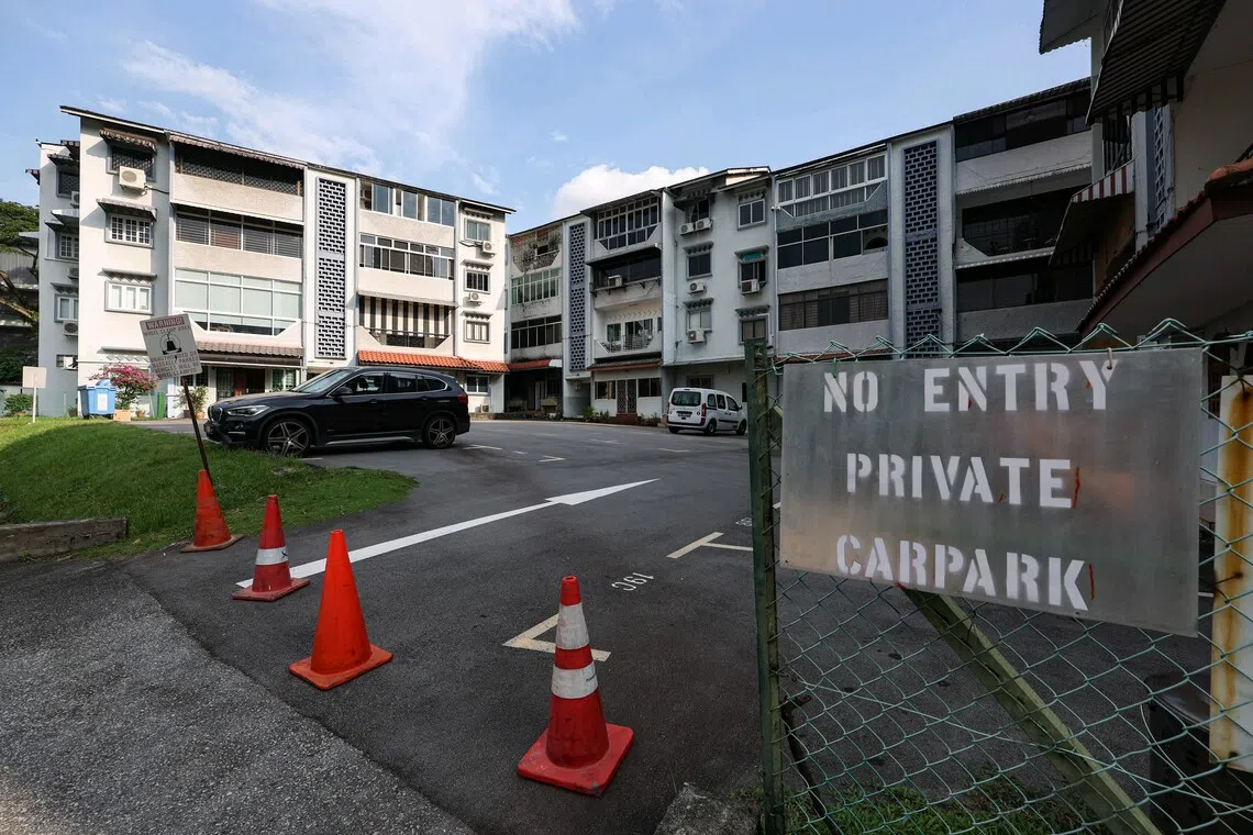 El ST notó que se habían instalado cuatro conos de tráfico en una de las dos entradas de la propiedad, que según la señora Tan estaban destinados a evitar la entrada de no residentes. Estacione su auto.