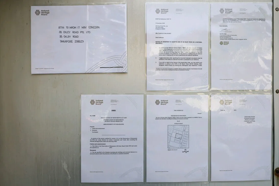 Aviso de la intención del gobierno de incluir 38 Oxley Road como Monumento Nacional el 4 de noviembre en la puerta de la propiedad.