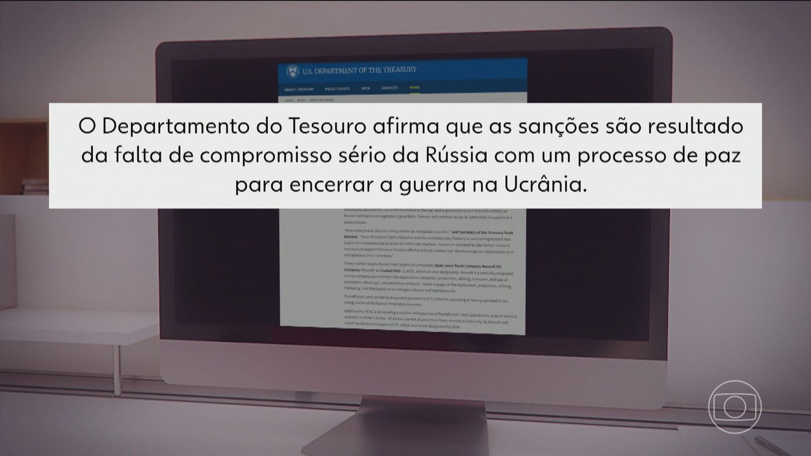 EE.UU. anuncia nuevas sanciones a las empresas petroleras rusas EE.UU. ha anunciado nuevas sanciones a las empresas rusas bajo presión para un alto el fuego con Ucrania. El Departamento del Tesoro de Estados Unidos tiene como objetivo a las dos mayores compañías petroleras de Rusia y sus filiales. En una declaración, el Departamento del Tesoro dijo que las sanciones se debían a la falta de compromiso serio de Rusia con un proceso de paz para poner fin a la guerra en Ucrania y pidió a Moscú negociar de buena fe. La decisión se produce tras nuevos ataques rusos. La grabación de un residente muestra el momento exacto en que un dron ruso impactó una zona residencial en Sumy, Ucrania. En otro frente, los rusos publicaron imágenes de un ejercicio militar con misiles balísticos con capacidad nuclear. La invasión de Ucrania y los ejercicios militares se producen mientras Kiev intenta convencer a Donald Trump de que el presidente ruso Vladimir Putin no está dispuesto a poner fin a la guerra y que se necesita una demostración de fuerza para llevarlo a la mesa de negociaciones. La respuesta llegó el miércoles (22). Tras insinuar una nueva reunión, el presidente estadounidense suspendió la reunión con Putin y anunció nuevas sanciones contra Rusia. Durante la semana pasada, Donald Trump ha mantenido el diálogo con ambas partes. Este miércoles (22), el presidente de Ucrania, Volodymyr Zelensky, dijo que acepta congelar las actuales líneas de batalla e iniciar negociaciones, como el presidente estadounidense, pero cree que el ruso Vladimir Putin no estará de acuerdo. Zelensky buscó misiles Tomahawk de largo alcance, pero Trump se resistió. Junto al secretario general de la OTAN, Mark Rutte, el estadounidense destacó que está en contra del envío de armas. Estados Unidos anuncia nuevas sanciones a las empresas rusas que presionan por un alto el fuego con Ucrania Reproducción/TV Globo Trump dice que no cree que Ucrania pueda ganar una guerra contra Rusia Trump le pide a Zelensky que llegue a un acuerdo con Putin y advierte que Rusia promete destruir Ucrania si no, dice un periódico