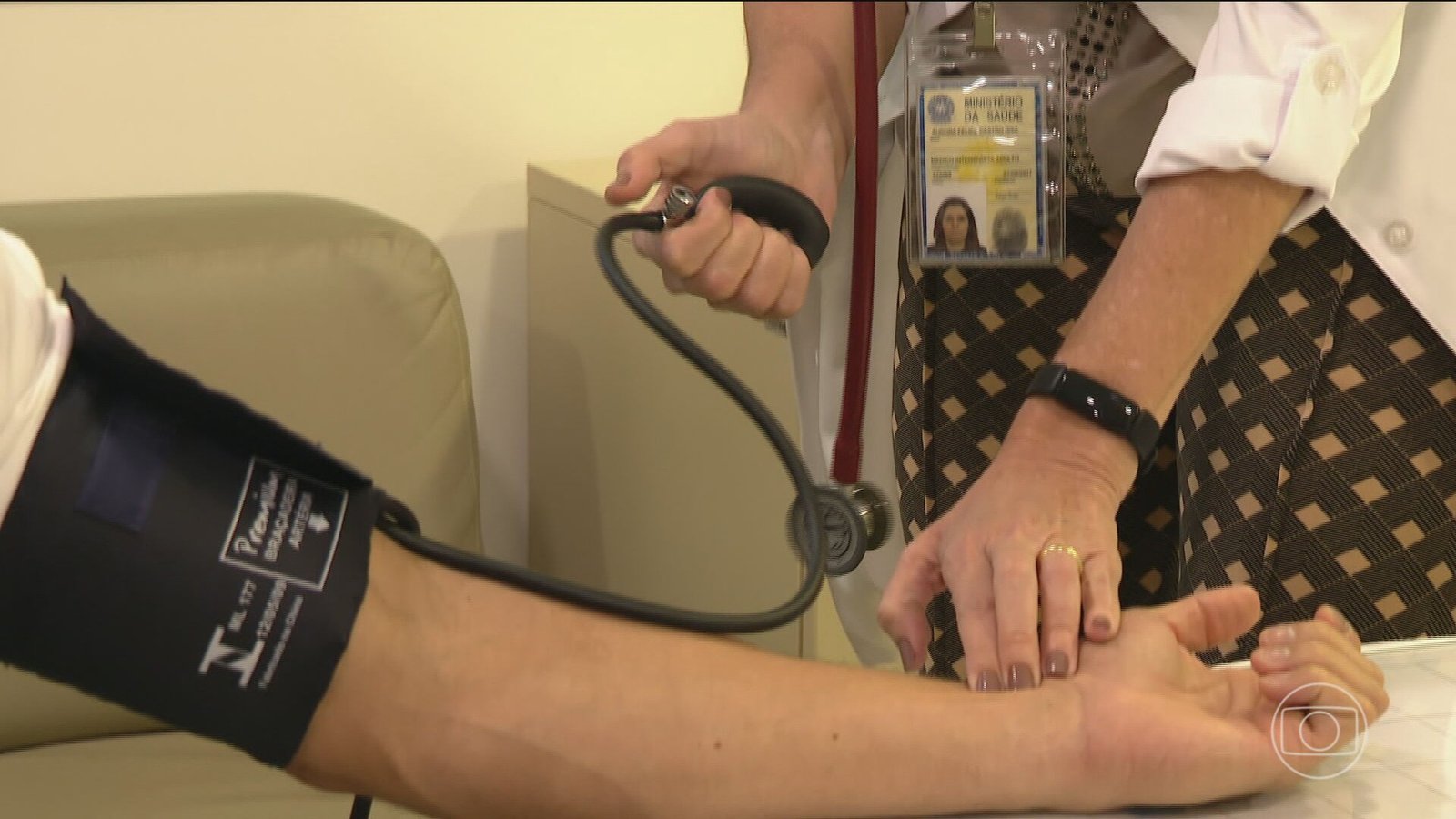 En la imagen, una mujer se acerca a un mostrador y se para junto a ella, mientras otro le indica que presione su mano derecha contra el mostrador y cuente hasta 40. Al final de la cuenta, él se aleja de la pared y el brazo, que previamente estaba presionado, se mueve hacia arriba por sí solo. La mujer que hizo la prueba dijo:La mano se levantó sola“Otro dijo:”Así medí la presión.