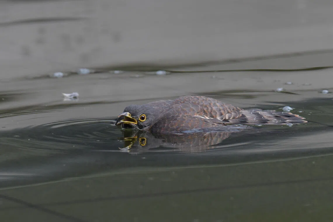 Un cuco halcón de Hodgson que se estrelló contra un edificio de ADM y aterrizó en un estanque.