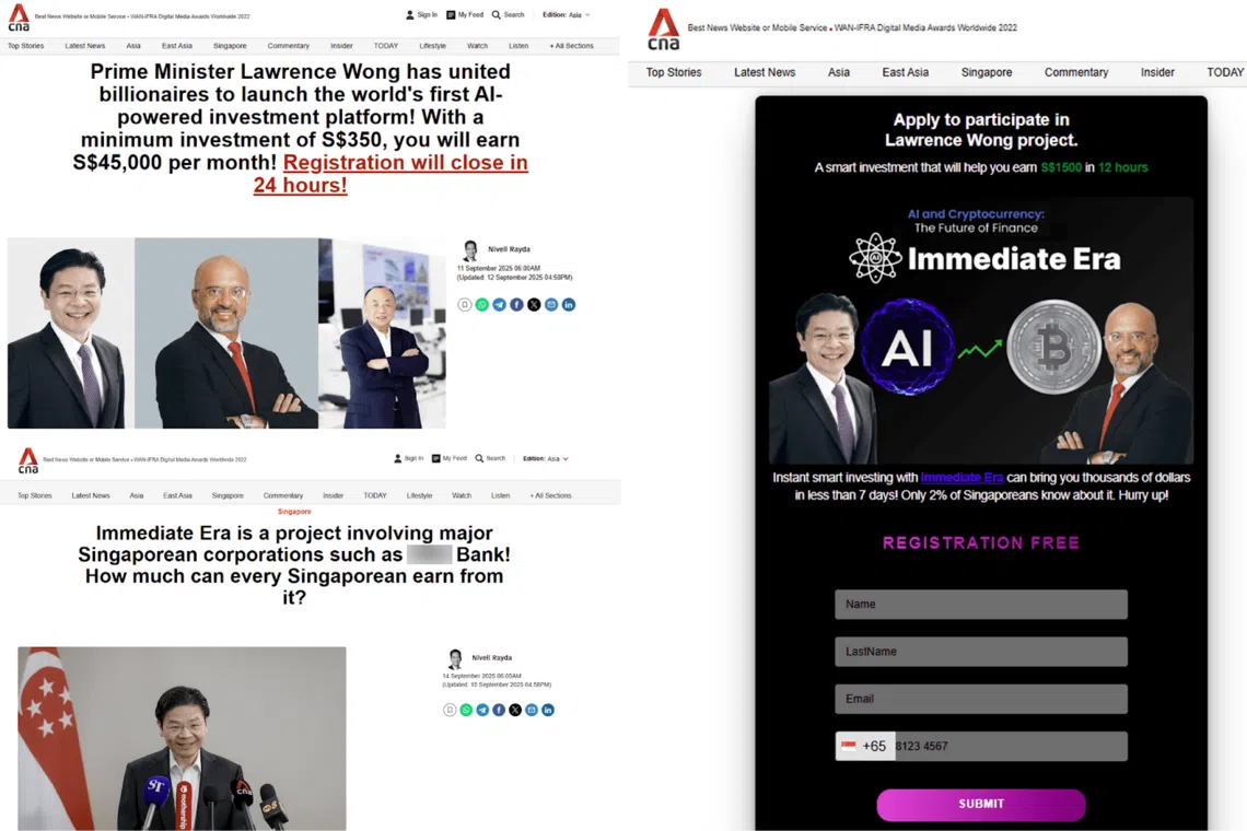 Estos anuncios hacían mal uso de imágenes de líderes de Singapur como el Primer Ministro Wong y el Ministro Coordinador de Asuntos de Seguridad Nacional, K. Shanmugam, para crear una ilusión de cumplimiento y al mismo tiempo promover retornos lucrativos de las inversiones.