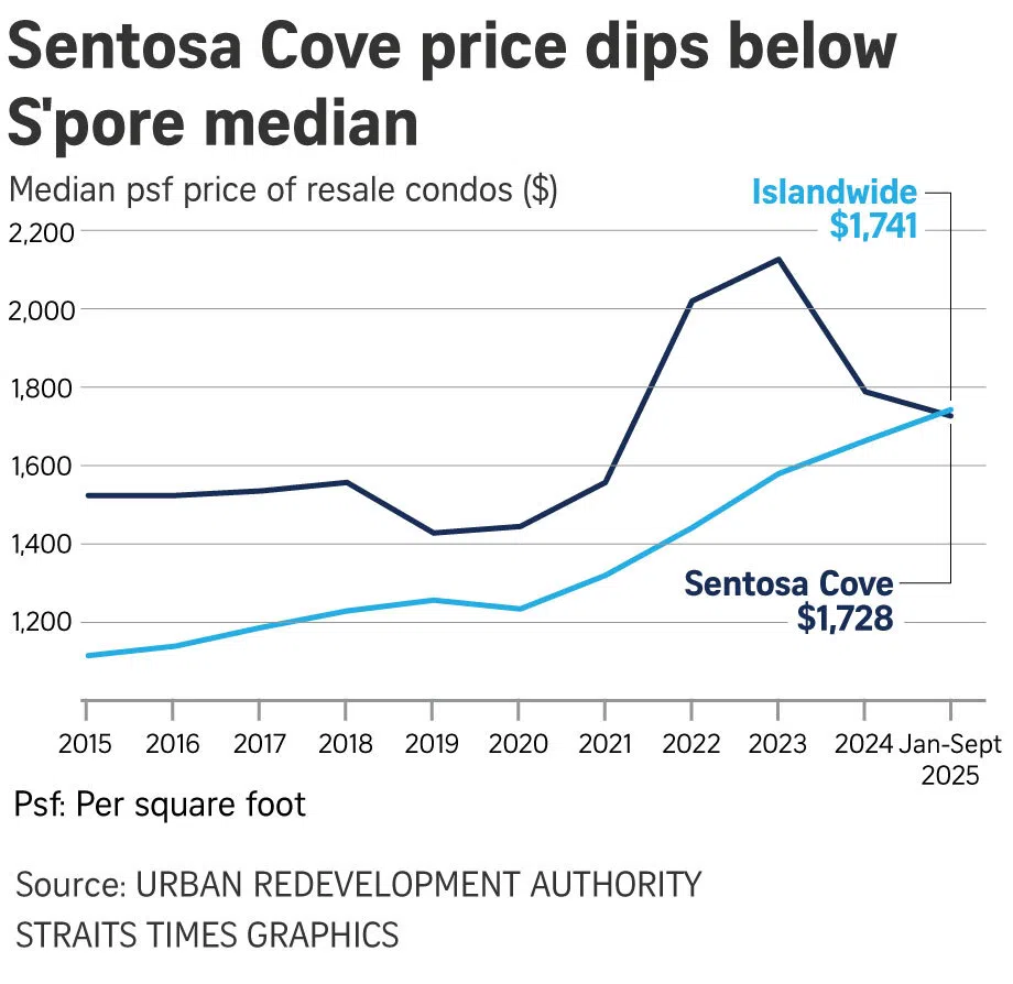 Los precios de las viviendas sin terreno en Sentosa Cove cayeron un 18,7 por ciento, desde un máximo de $2125 por pie cuadrado (psf) en 2023 a alrededor de $1792 psf en 2024 y $1728 psf en los primeros nueve meses de 2025. Los precios de las viviendas en la isla también han bajado: aproximadamente un 13,1 por ciento, de $2210 psf en 2023 a $1842 psf en 2025, según mostraron las cifras de la Autoridad de Reurbanización Urbana (URA).