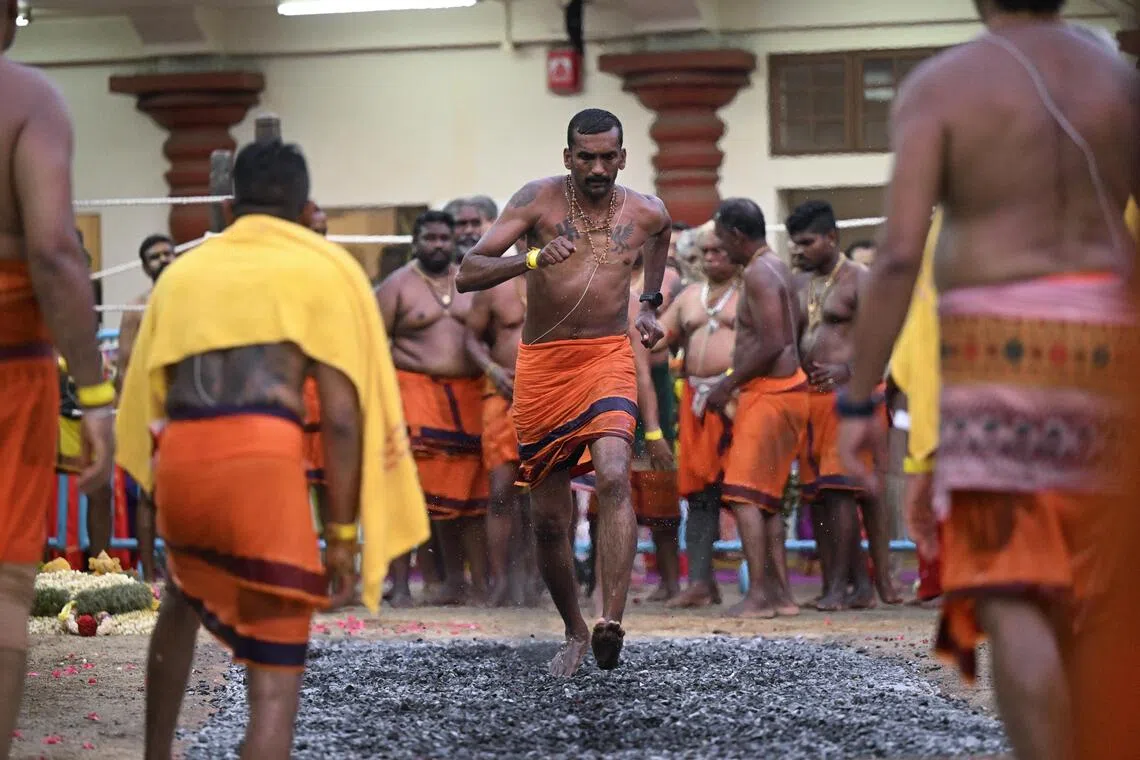 El 12 de octubre, los fanáticos cruzaron el Fire Pitt en el templo de Shri Maryamman durante el Festival Anual Thamethi Bijha o Fire Walking Festival.