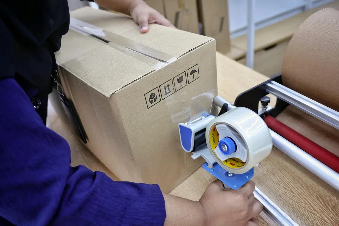 Zafira sella la caja para preparar un pedido en línea para su entrega en el Centro Mustafa.