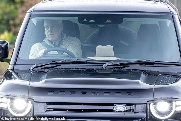 Andrew fue visto con una expresión solemne en su rostro mientras conducía su defensor Land Rover fuera del Royal Lodge hoy.