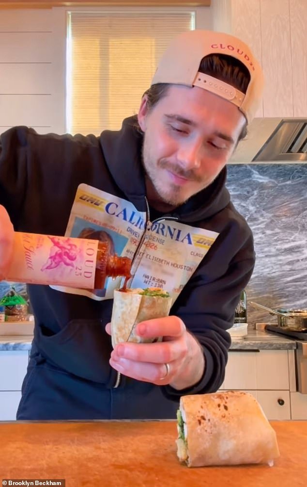 En el clip, Brooklyn llevaba una sudadera de licencia de conducir Whitney Houston y una gorra de béisbol hacia atrás, de su marca de salsa picante Cloud23.