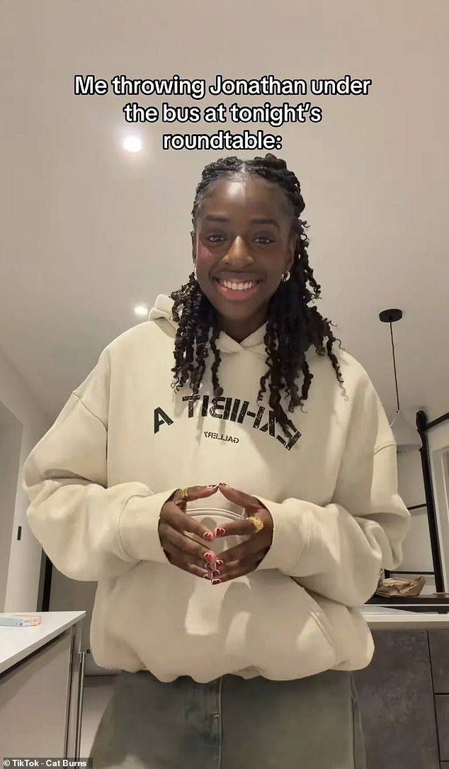 “Yo tirando a Jonathan debajo del autobús en la mesa redonda de esta noche”, escribió en el clip que la mostraba sonriendo a la cámara, sincronizando los labios con el audio que detallaba la “ambiente apagada” de una persona.