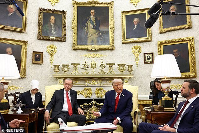 Bling-Tastic no comienza a describir la visión de Trump para la casa más famosa de Estados Unidos. El 47º presidente, en la Oficina Oval el jueves, con el presidente Erdogan de Turquía (centro) y el vicepresidente JD Vance