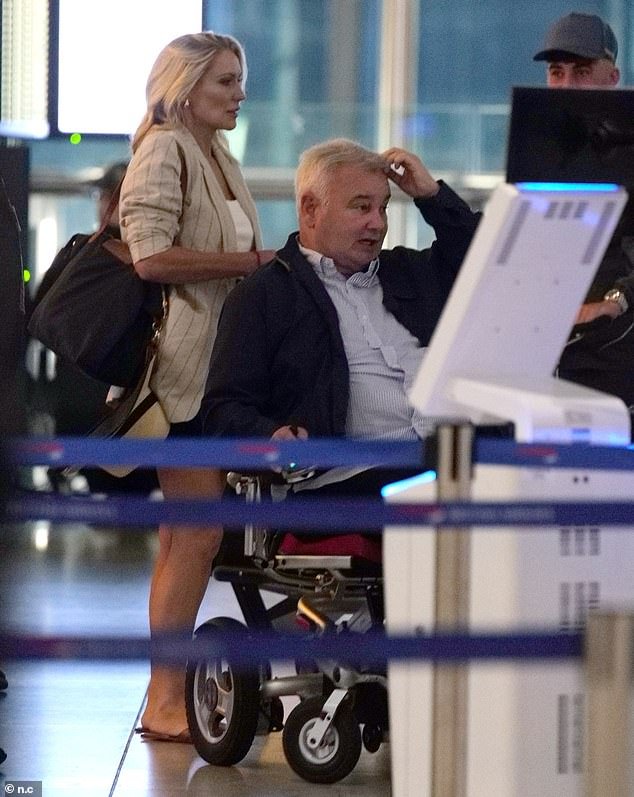 Eamonn, que usa una silla de ruedas motorizada debido a problemas de espalda en curso, cortó una figura causal en una camisa a rayas de alfiler y pantalones oscuros cuando llegó al aeropuerto