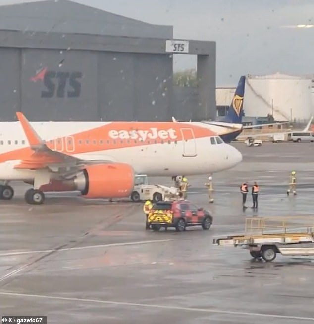 Los equipos de rescate fueron vistos frenéticamente corriendo hacia un vuelo de EasyJet después de que se castigó en el aeropuerto de Manchester después de una ‘colisión’ el sábado