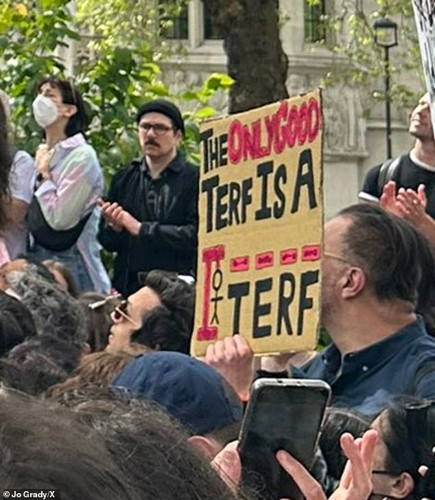 Si bien la mayoría de los pancartas luchando por los derechos trans, dos letreros vistos en el Rally en el Parlamento Square mostraron una ilustración de Hangman junto con las palabras ‘El único buen terf es un … Terf’.