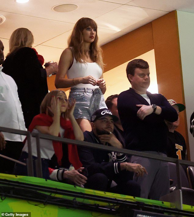 Sin embargo, la música de humor cambió drásticamente. Con el equipo de su novio perdiendo mal en el medio tiempo y Travis de pie desanimado debajo de ella, haciendo una mueca mientras se limpió la mano sobre su frente en un gesto de desconcierto, Taylor parecía más inquietante de la presencia ‘, continuó James.