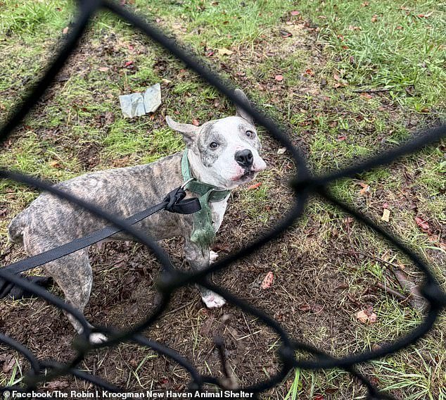 Fotos desgarradoras compartidas por el refugio de animales Robin I. Kroogman New Haven en New Haven muestran a la pequeña mascota sola, sujeta a una cerca de metal con su correa en un área cubierta de césped el lunes durante las inclemencias del tiempo causadas por la tormenta.