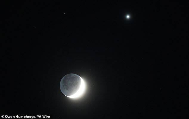 Se pudo ver el planeta flotando sobre la luna desde algunas partes del Reino Unido apenas unas horas después del atardecer de esta tarde.