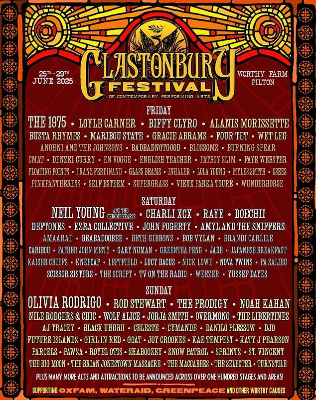 Glastonbury Festival ha revelado la alineación para el evento de este año, ya que anunció los actos principales que incluyen el 1975, Neil Young y Olivia Rodrigo.