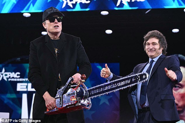 Musk asistió a la conferencia de acción política conservadora con el primer ministro de Argentina, Javier Millei, donde sostuvo una motosierra mientras usaba gafas de sol aviador y un sombrero de magia para representar los recortes que estaba haciendo al gobierno federal.