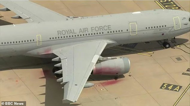 El metraje de la cámara del cuerpo luego los muestra rociando la pintura roja en los motores de turbina de los petroleros de reabastecimiento de combustible aire-aire que la RAF dice que son “vitales para mejorar el alcance operativo y la flexibilidad del poder aéreo militar de Gran Bretaña”.