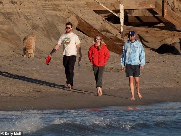 El hijo de Rob Reiner, Jake, en la foto a la derecha, disfrutó de un relajante paseo por la playa al atardecer con su novia María Gilfillan y el novio de su hermana Romy, Alex Silberberg, en el sur de California el domingo.