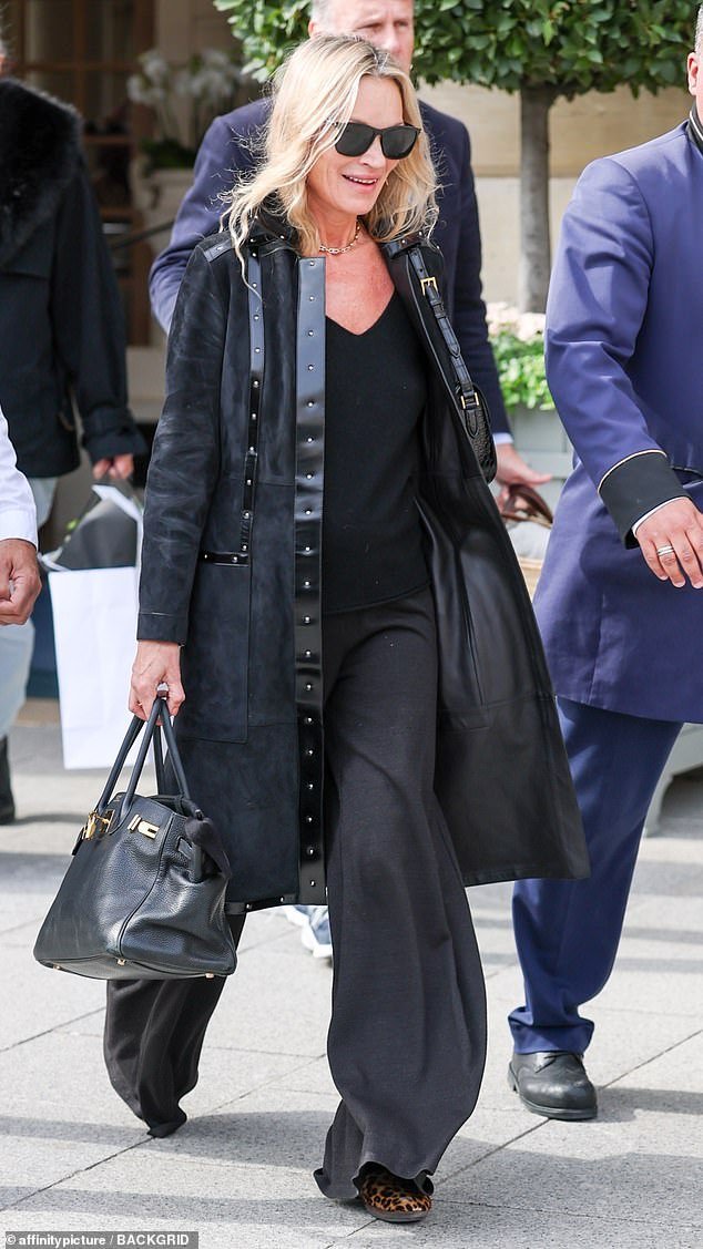 Kate Moss, de 51 años, se veía sin esfuerzo elegante con un abrigo de gamuza negra cuando salió del hotel Ritz en París el jueves durante la Semana de la Moda de París