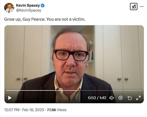 El martes, Spacey recurrió a X para publicar un video mordaz subtitulado: ‘Crecer Guy Pearceno eres una víctima.