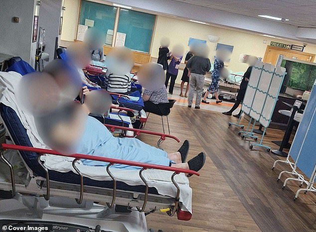 En la foto, los pacientes duermen en camas que bordean un pasillo del hospital en el departamento de urgencias del Hospital William Harvey en Ashford.