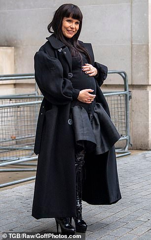 La cantante, de 44 años, sonrió mientras acunaba su creciente panza en New Broadcasting House en Londres para un espectáculo de reunión.