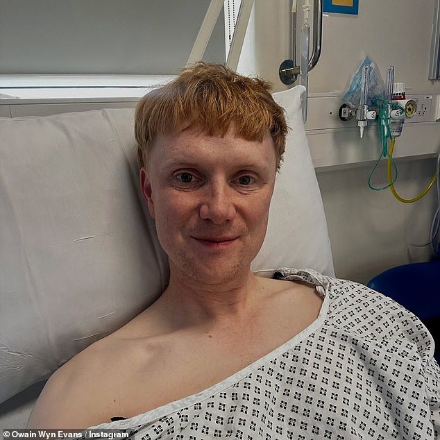 En su publicación, Owain compartió una selfie de sí mismo con su bata de hospital en la cama de la sala, y una segunda de él recuperándose en casa con su gato rescatado Franny a su lado.