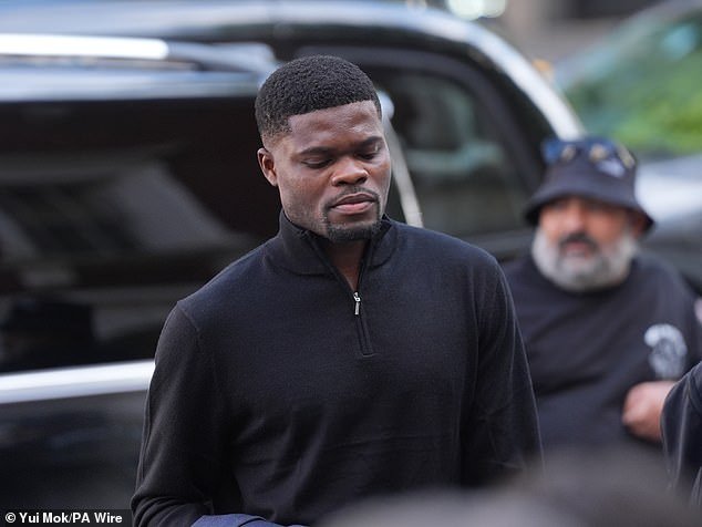 Partey, vestido con un jersey negro y pantalones y sosteniendo una chaqueta de traje sobre su brazo, salió de un portador de personas antes de llegar al edificio.