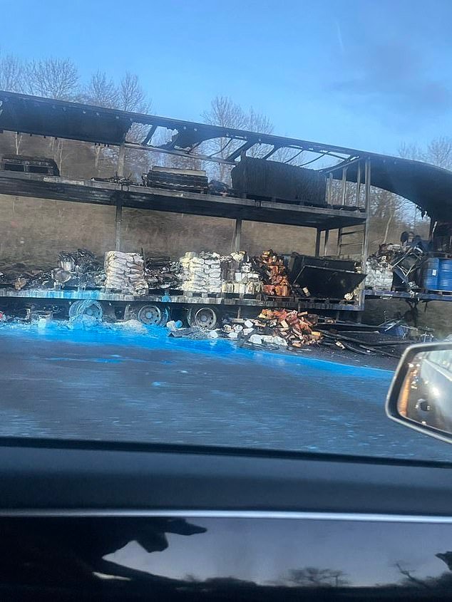Los conductores han estado atrapados durante horas en la M40 después de que un camión se incendiara. En la imagen: la lona del camión quedó completamente quemada en el incendio, que también incineró las mercancías del vehículo.