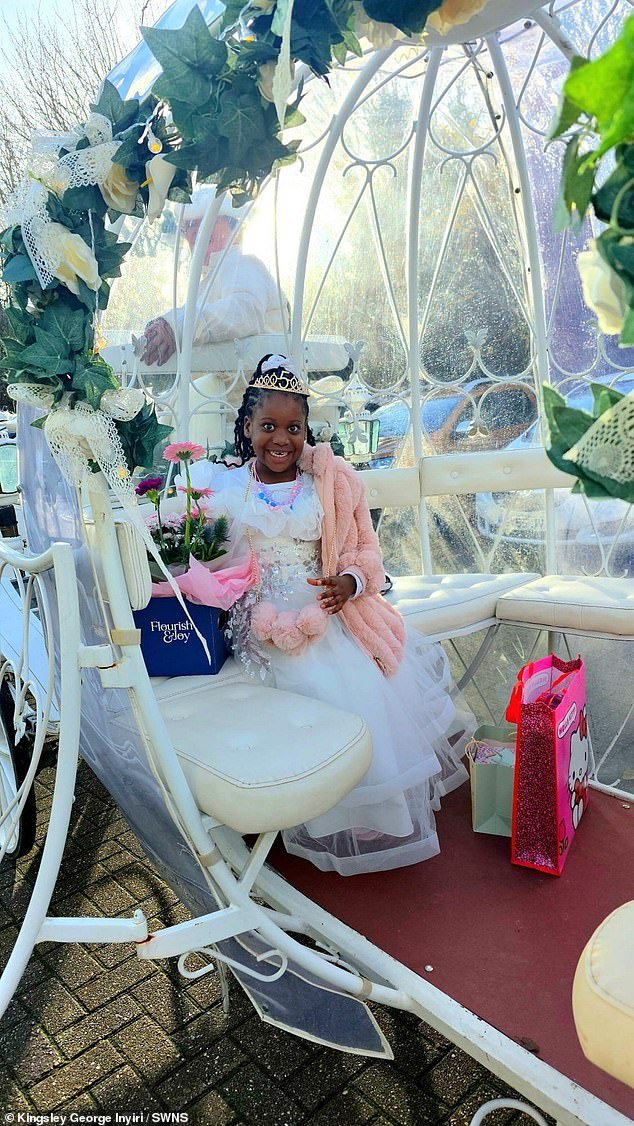 Rebecca Kingsley Inyiri, de cinco años, llegó a su fiesta de cumpleaños el 6 de diciembre en un carruaje tirado por caballos estilo Cenicienta.