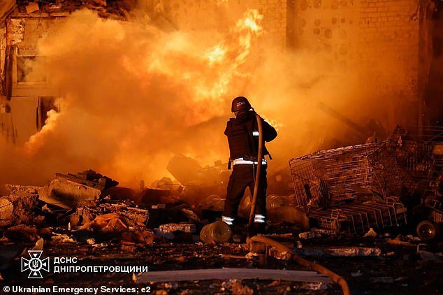 La OTAN ha revuelto los aviones de combate después de que Putin lanzó un gran ataque aéreo en Ucrania durante la noche. La captura de pantalla muestra un bombero que pone llamas en la región de Dnipropetrovsk después de que fue atacado por huelgas rusas