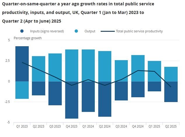 La ONS afirmó que los “insumos” de los servicios públicos, principalmente la financiación, crecieron un 2,5 por ciento interanual. Los laboristas resolvieron una serie de disputas salariales con los sindicatos después de llegar al poder en julio y aumentaron el gasto.