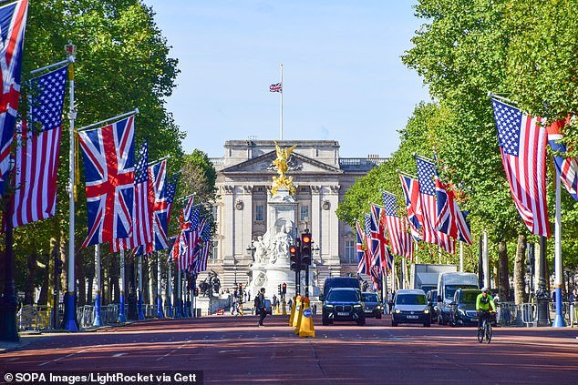 Las banderas estadounidenses y las banderas de la Unión Jack decoran el centro comercial que conduce al Palacio de Buckingham antes de la visita estatal de Donald Trump el mes pasado
