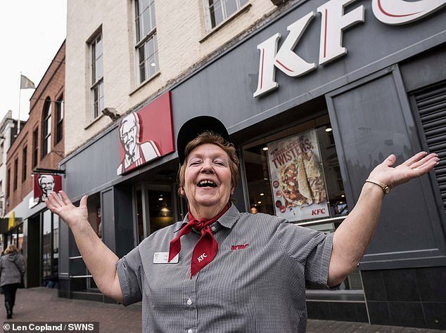 Pauline Richards, en la foto, conocida como Miss KFC, murió el mes pasado a la edad de 74 años y trabajó en casi todos los papel en la sucursal de Taunton, Somerset, desde limpiador hasta cajero y líder del equipo