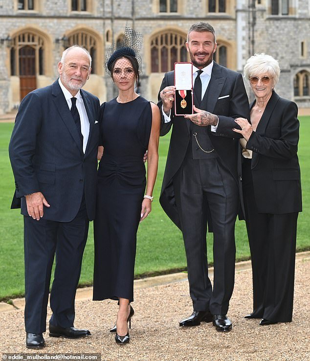 Victoria y Sandra Beckham observaron con orgullo cómo David recibió su título de Caballero de manos del Rey en Windsor el martes, mientras lucían increíblemente elegantes.