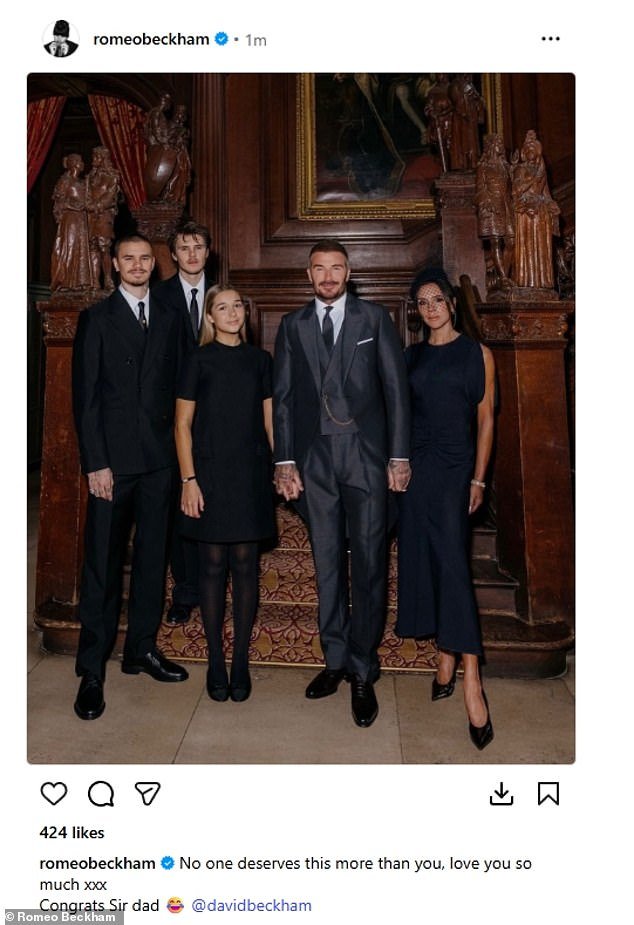Romeo compartió una foto familiar mientras David celebraba el honor con su esposa Victoria y sus tres hijos menores, Romeo, de 23 años, Cruz, de 20 y Harper, de 14.