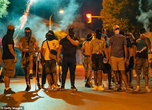 Los manifestantes con máscaras y balaclavas tienen cadenas, palos y murciélagos de béisbol durante la cuarta noche de disturbios el 14 de julio de 2025 en Torrepacheco, en la provincia de Murcia, España